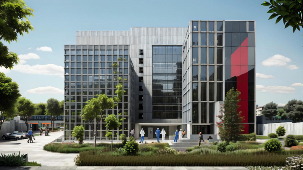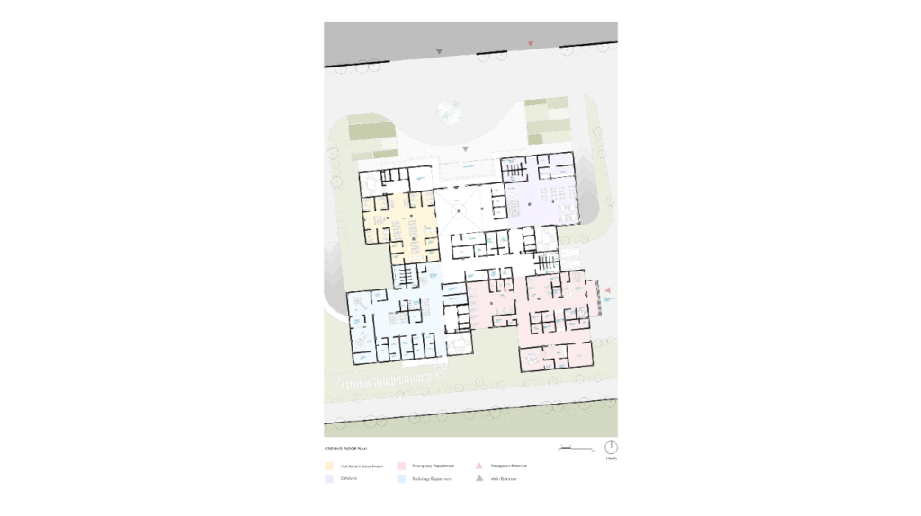 “Functionality: Ensure that interactive spaces are functional, user-friendly, and accessible to patients with diverse needs. Flexibility: Design spaces that can adapt to various healthcare requirements and patient preferences. Collaborative Areas: Create zones that encourage interaction among patients, families, and healthcare providers for a supportive community feel.” Dense green coverage in the surrounding can be integrated in the designing process of a hospital.